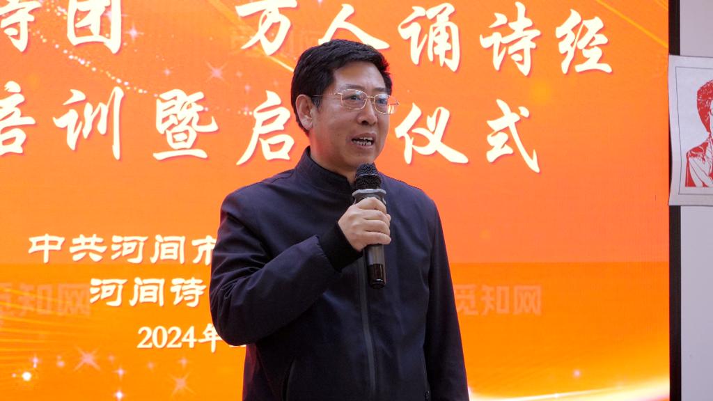 活動現場,滄州河間市委宣傳部常務副部長楊青松致辭。他表示,“百人講詩團 萬人誦詩經”這項活動旨在吸引更多的人來讀《詩經》、講《詩經》,培養更優質高效的《詩經》宣講隊伍,擴大《詩經》在河間的受眾群體。希望各位老師和學員認真研習《詩經》文本,掌握《詩經》典故,保持敬畏之心,深耕文本,涵通大義,筑牢基礎;樹立奮斗之志,真正把學與講貫穿始終,身體力行,篤行不怠;涵養團結之風,精誠團結,和衷共濟,形成合力。